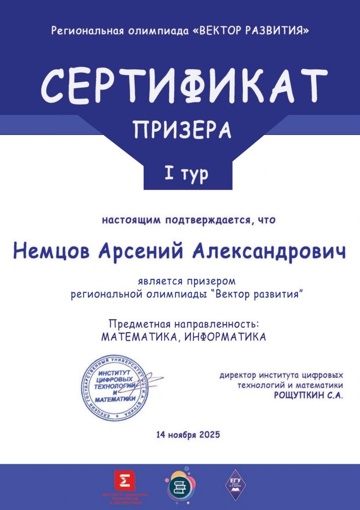 Поздравляем наших талантливых гимназистов: Макарцева Николая (11 класс), Алферова Алексея (10 класс), Немцова Арсения (10 класс) с успешным прохождением на 2-ой тур региональной олимпиады «Вектор развития», которая собрала самых ярких юных умов в области математики, информатики и физики.